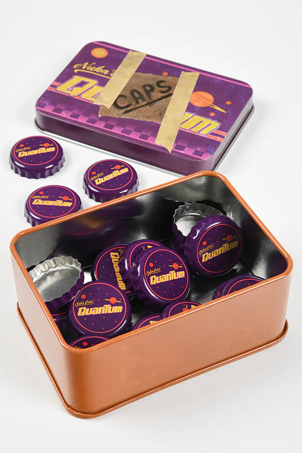 Introducing the Fallout Bottle Cap Series: Nuka Quantum with Collectible Tin. It includes 20 bottle caps featuring Nuka-Cola Quantum branding: logo, planets, and all. This same design is present in the tin the caps come in, albeit boasting a little distress from being out and about in the Wasteland.